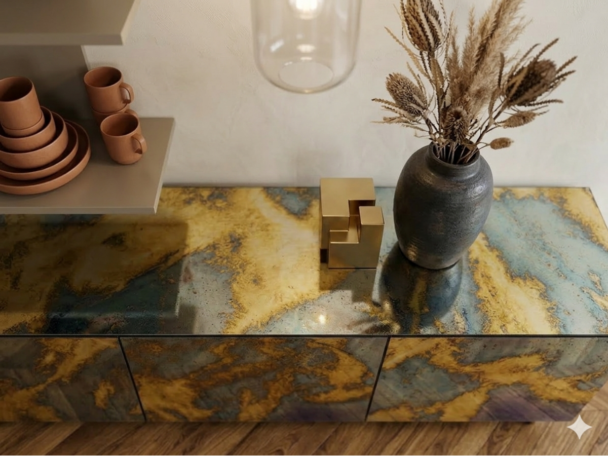 - Lasipeilin kuvio on aina uniikki - niitä ei ole kahta samanlaista - tämän ansiosta Tv-taso Milano Gold on aina ainutlaatuinen design-tuote.