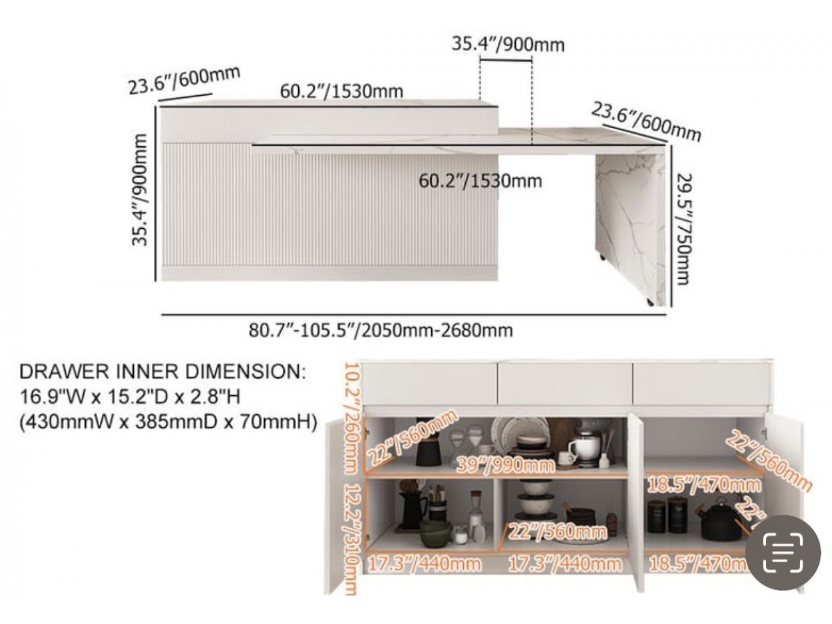 • Jatkettava Pöytätaso: Marmorikuvioitu pöytätaso ei ole vain visuaalisesti houkutteleva, vaan myös käytännöllinen. Se tarjoaa runsaasti tilaa ruoanlaittoon ja leivontaan, ja sen jatkettavan ominaisuuden ansiosta voit helposti laajentaa työskentelytilaa tarvittaessa.